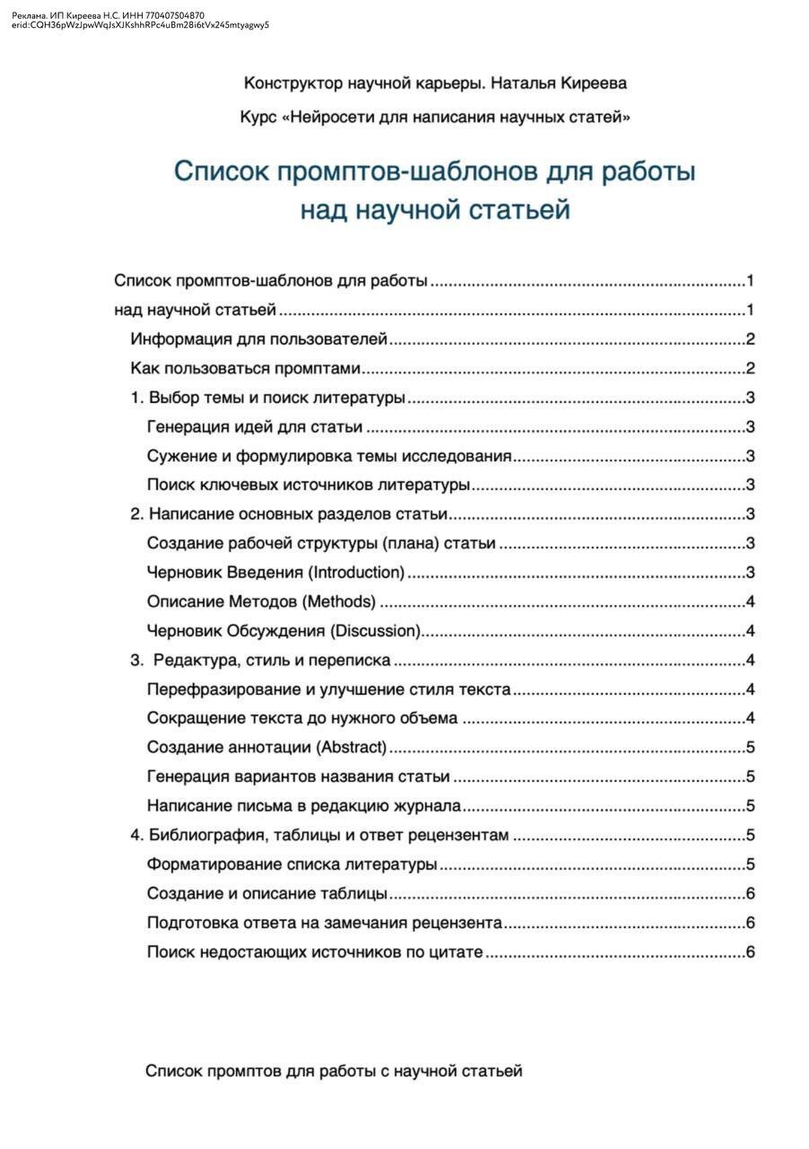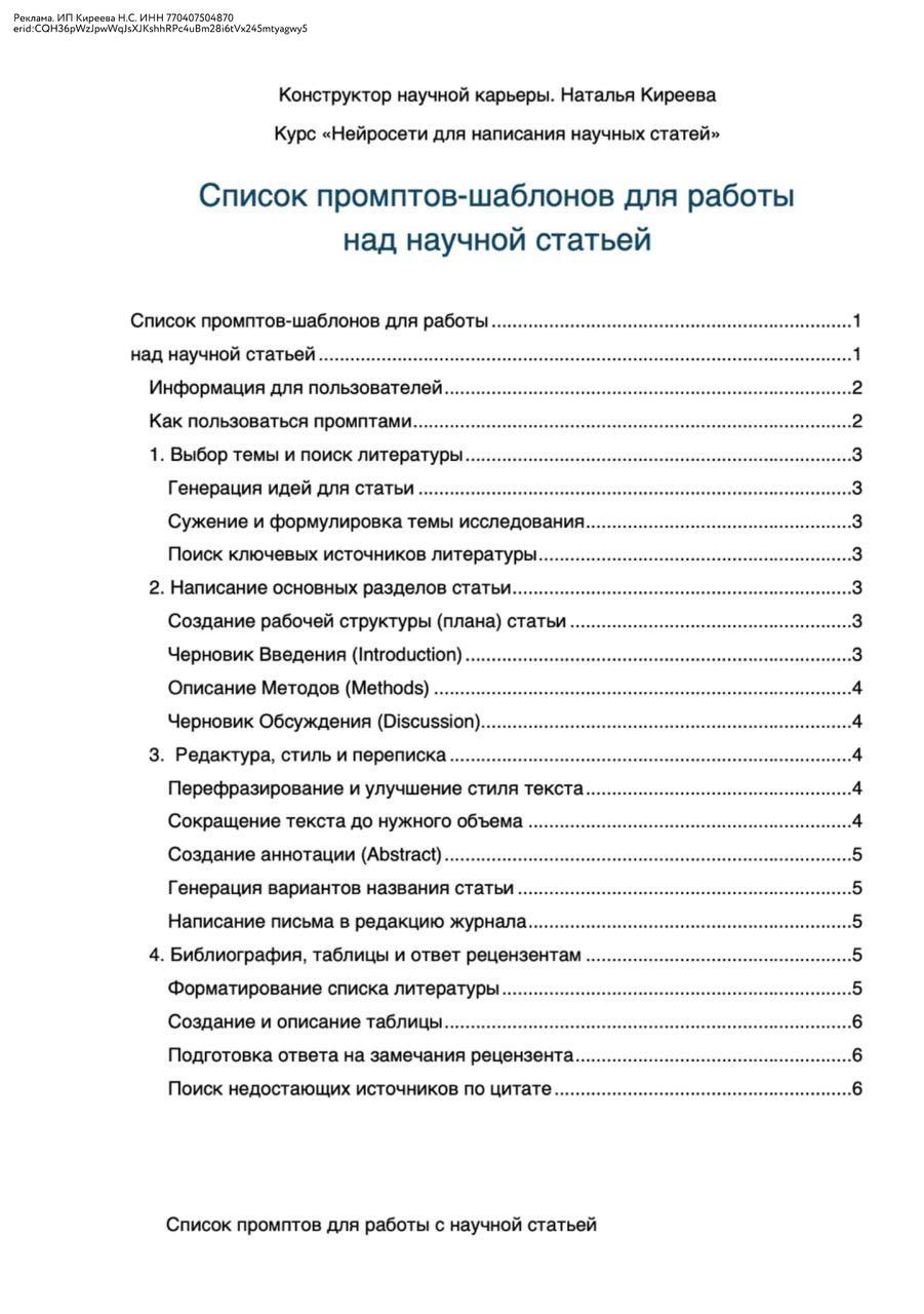 - Набор из 20+ готовых промптов для каждого этапа написания статьи.