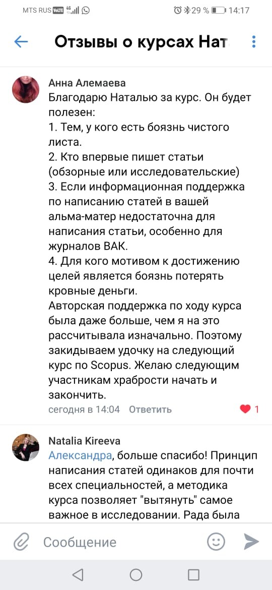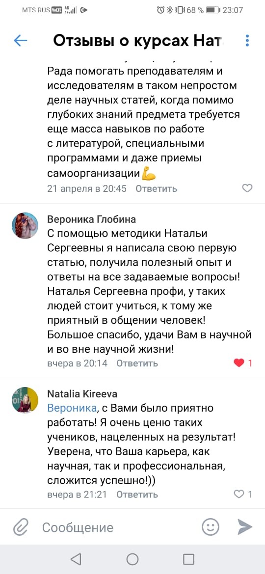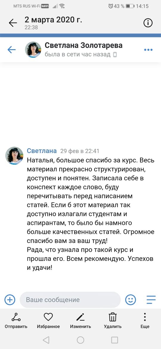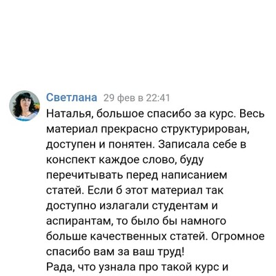 Наталья Сергеевна, хочу Вам похвастаться! Мою статью приняли к публикации! Радости нет предела!!! Спасибо еще раз за Ваш курс! И, кстати, навыки написания статьи очень помогли в написании диплома.