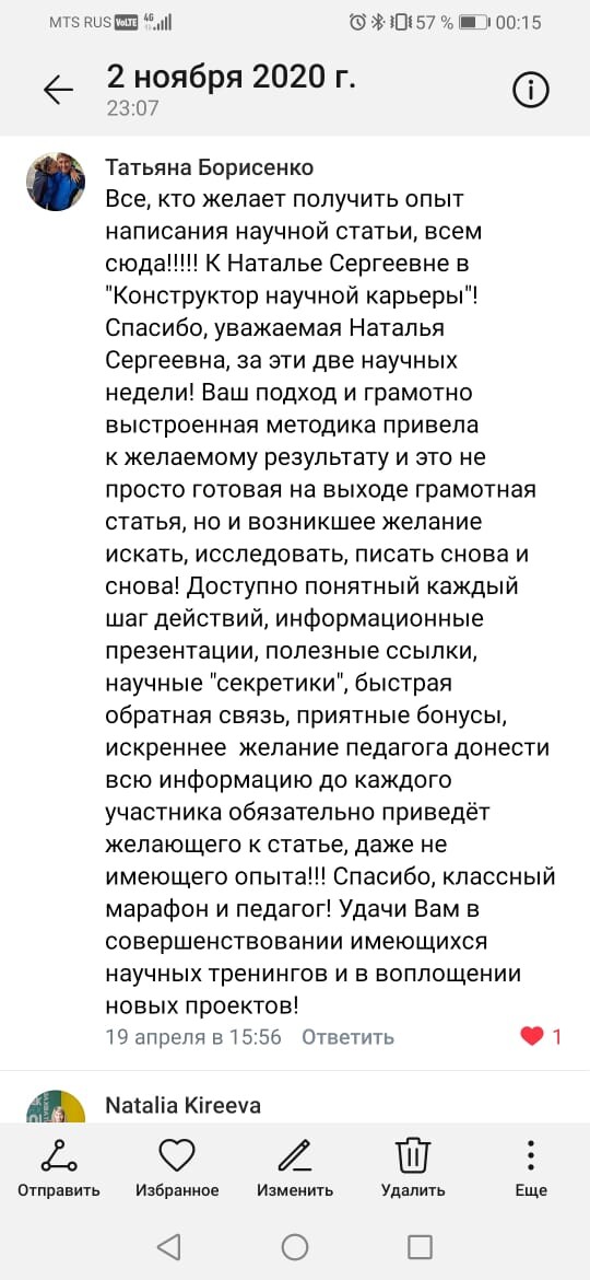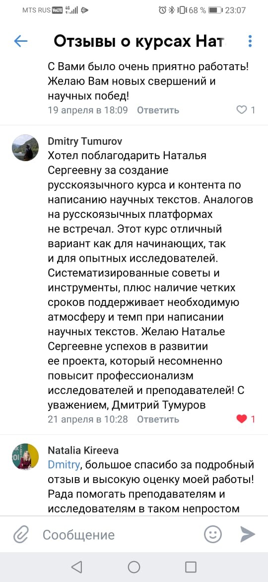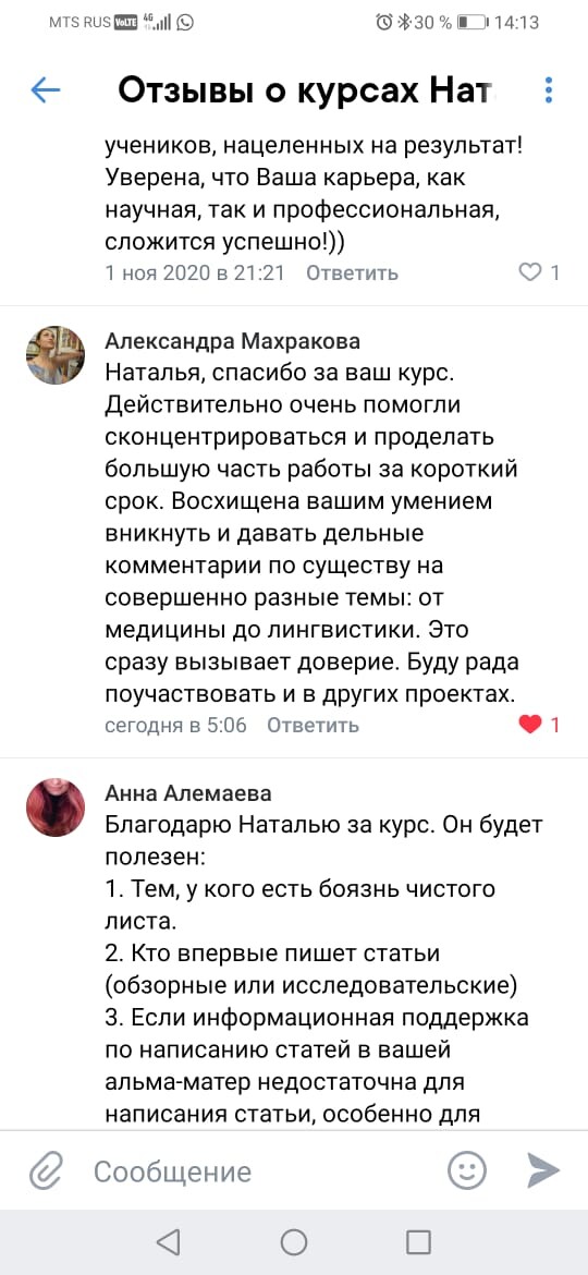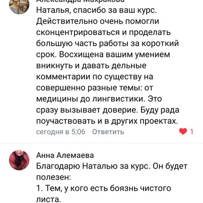 Считаю огромным везением, что мне удалось попасть к Наталье! Профи, опытнейший специалист и требовательный преподаватель! Задания понятные, всё по сути и, как говорится, "без воды". Своевременная и качественная обратная связь. Это определённо что-то инновационное в сфере онлайн-курсов и, безусловно, очень полезное для всех, кто занимается наукой!
