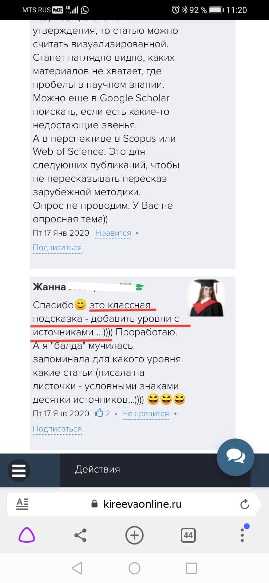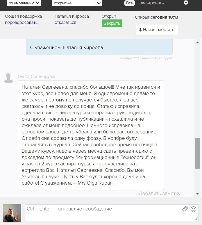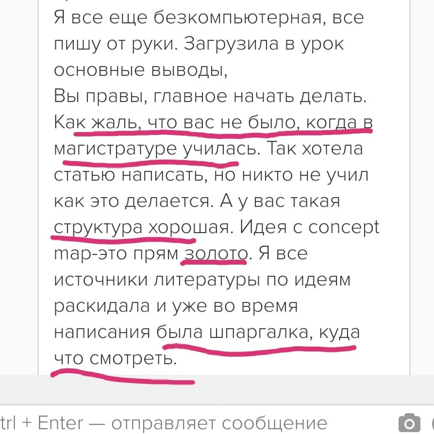 Хочу похвастаться: одна из моих магистранток получила ПЕРВОЕ место на конкурсе научных работ университета. Причем мы подавали выжимку ее бакалаврской работы. Мы с ней подкорректировали работу. Я использовала те знания, которые получила на Вашем курсе. Причем, я была единственным научным руководителем без ученой степени. И второй момент, в нагрузке у меня руководство 4 бакалаврами и 3 магистрами. У меня "закончились места" еще в мае. Это "сарафанное радио" студентов. И третий момент, все выпускники были особо отмечены председателями ГАКов. Магистры (их у меня было 4) получили интересные предложения по работе от работодателей, которые присутствовали на защитах. И это во многом благодаря Вашему курсу! Это побочный эффект Вашего обучения!