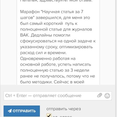 Ко всем подобным предложениям я отношусь скептически, потому что, как правило, курсы предлагают уже известную информацию по несколько завышенной цене. Поэтому существовал определенный риск, но формат марафона (потеря уплаченных денег в случае срыва дедлайна:) - стал решающим при выборе. И, в случае со мной, методика полностью оправдала себя :) Данные систематизированы, статья написана, издание выбрано, составлено сопроводительное письмо. Я довольна. Спасибо!
